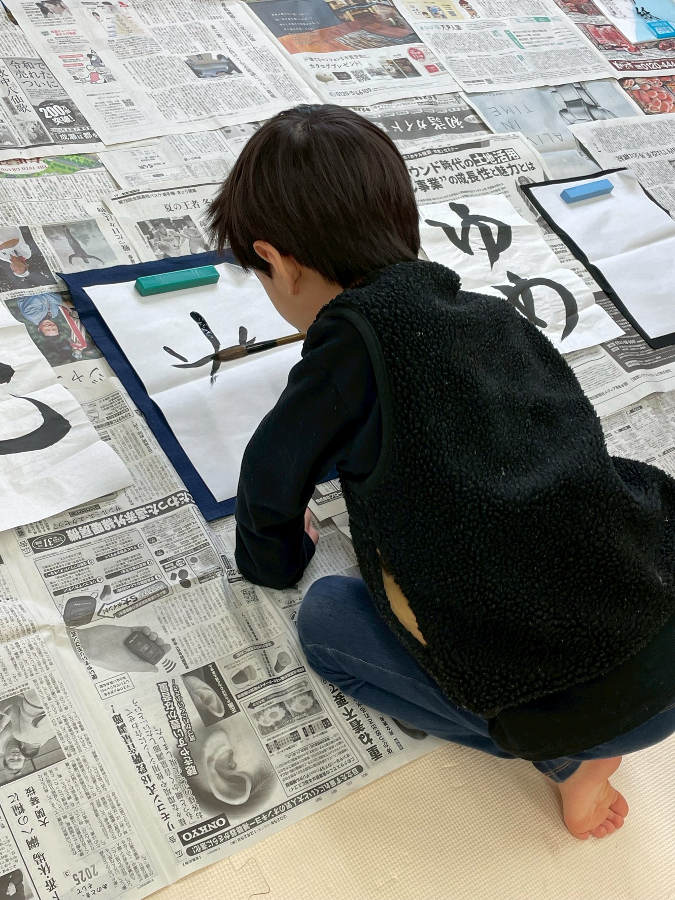 書き終えた作品は、新聞紙で挟んで乾かして