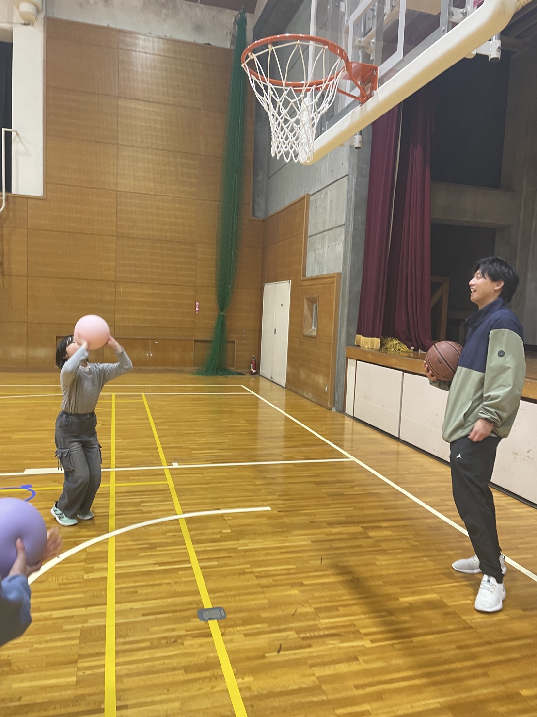では、今週は体育館を使ってバスケットの活動を行っています。